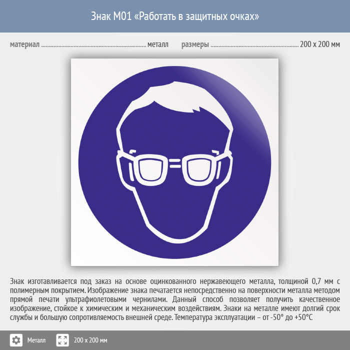 Знак M01 «Работать в защитных очках» (металл, 200х200 мм) в Пензе купить
