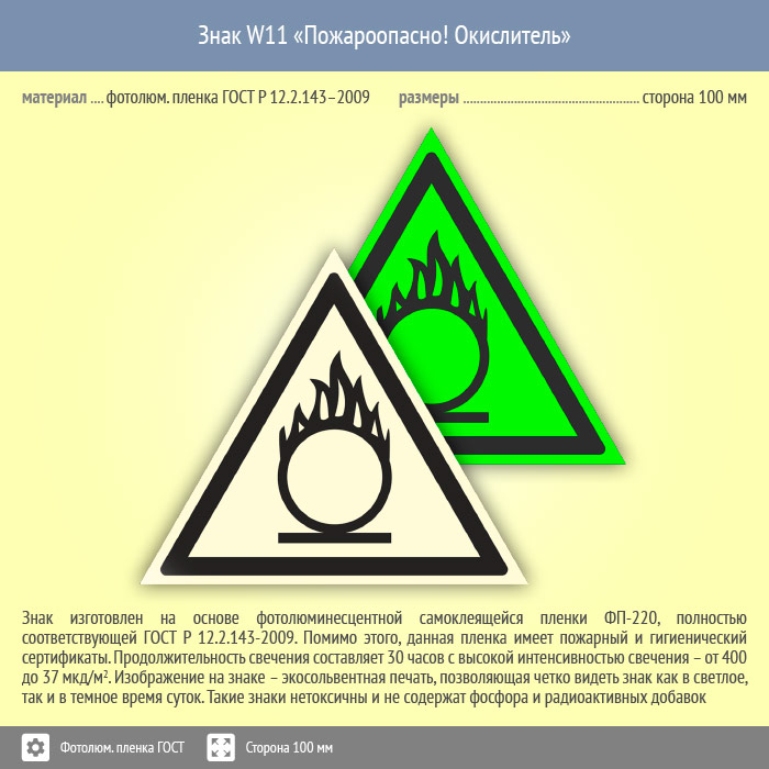Знак W11 «Пожароопасно! окислитель» (фотолюминесцентная пленка ГОСТ 34428-2018, сторона 100 мм) в Пензе купить