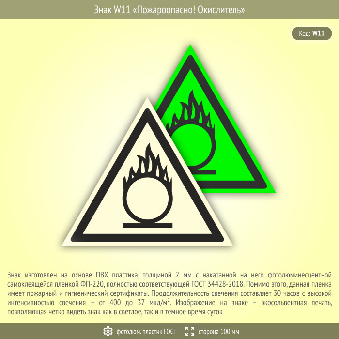 Знак W11 «Пожароопасно! Окислитель» (фотолюминесцентный пластик ГОСТ 34428-2018, сторона 100 мм) в Пензе купить