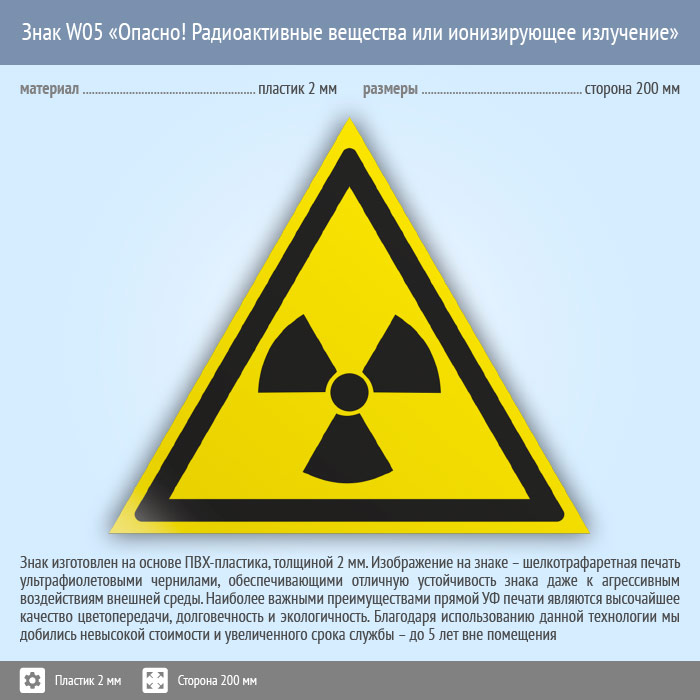 Знак W05 «Опасно! радиоактивные вещества или ионизирующее излучение» (пластик, сторона 200 мм) в Пензе купить