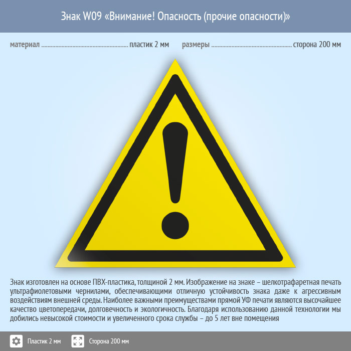 Знак W09 «Внимание! опасность (прочие опасности)» (пластик, сторона 200 мм) в Пензе купить