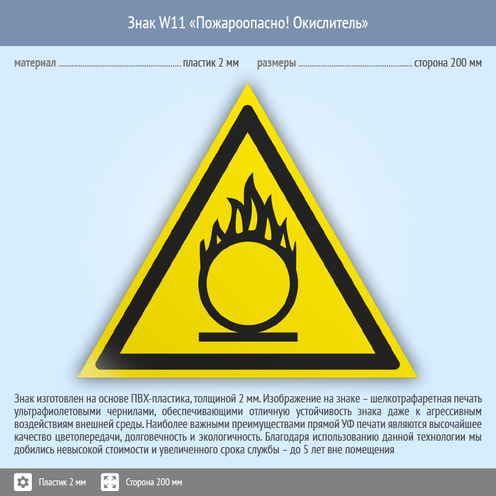 Знак W11 «Пожароопасно! окислитель» (пластик, сторона 200 мм) в Пензе купить