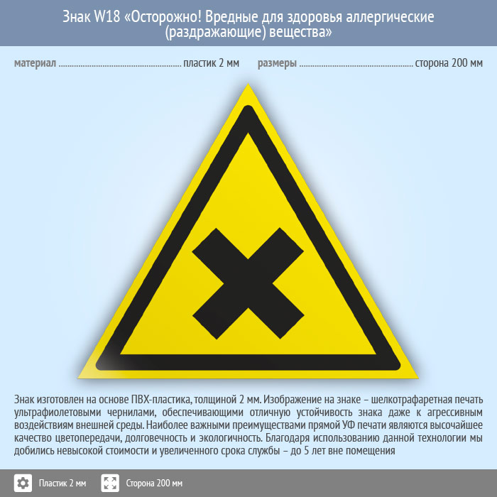 Знак W18 «Осторожно! вредные для здоровья аллергические (раздражающие) вещества» (пластик, сторона 200 мм) в Пензе купить
