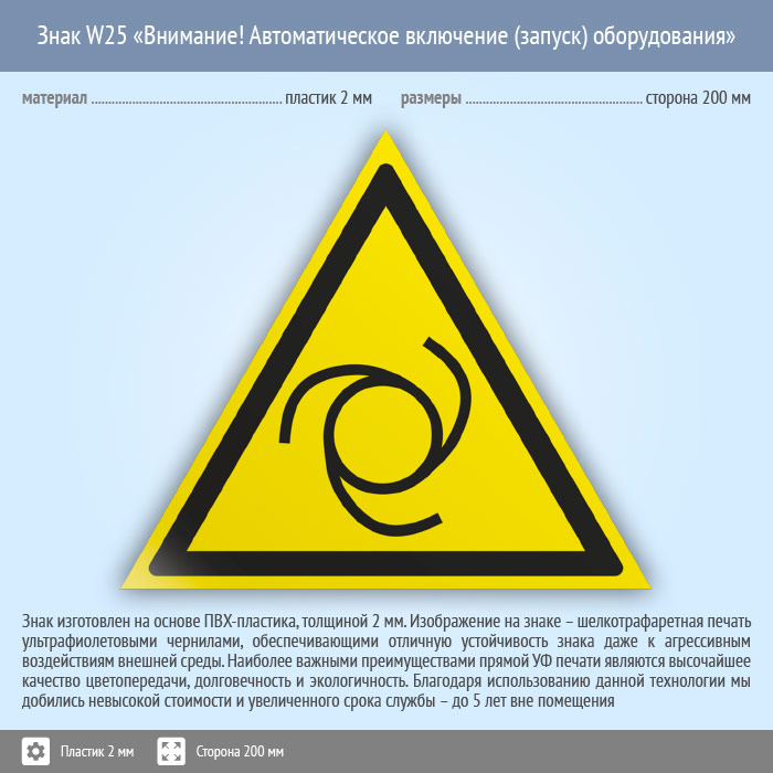Знак W25 «Внимание! автоматическое включение (запуск) оборудования» (пластик, сторона 200 мм) в Пензе купить