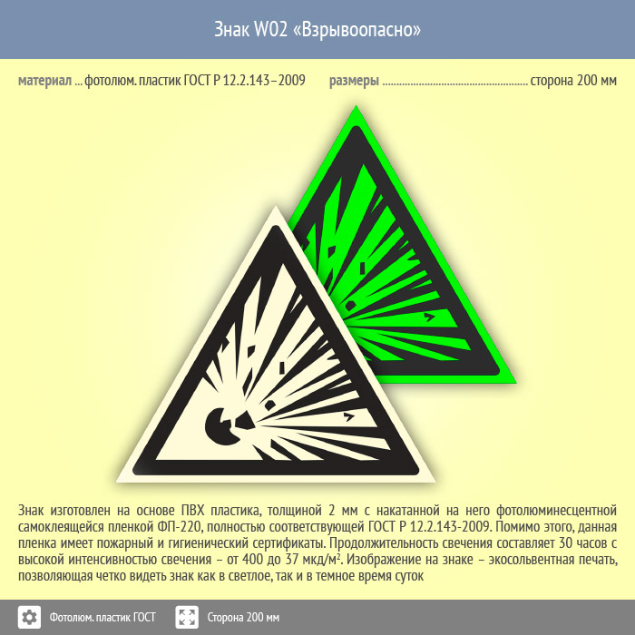 Знак W02 «Взрывоопасно» (фотолюминесцентный пластик ГОСТ 34428-2018, сторона 200 мм) в Пензе купить
