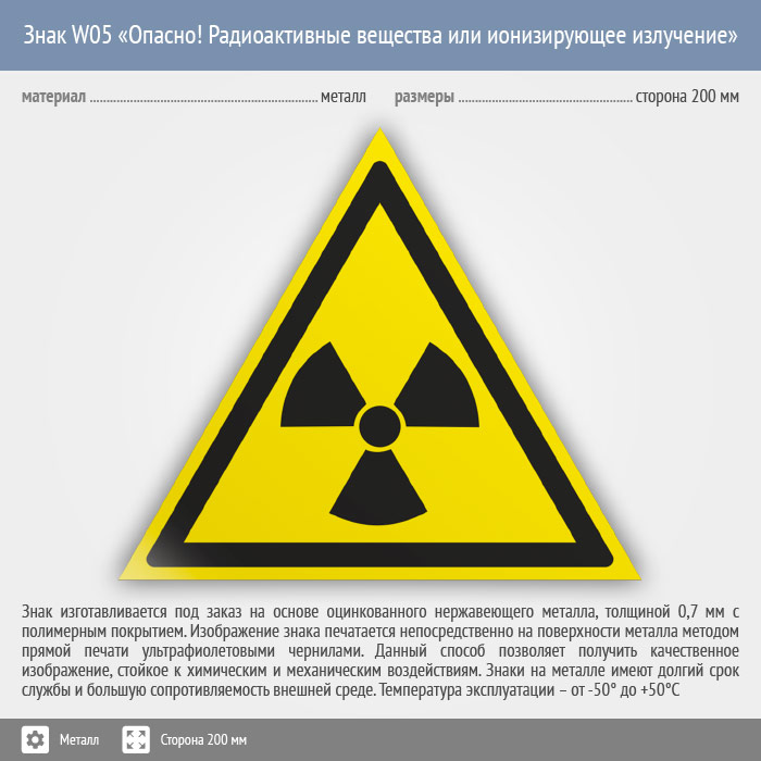 Знак W05 «Опасно! радиоактивные вещества или ионизирующее излучение» (металл, сторона 200 мм) в Пензе купить