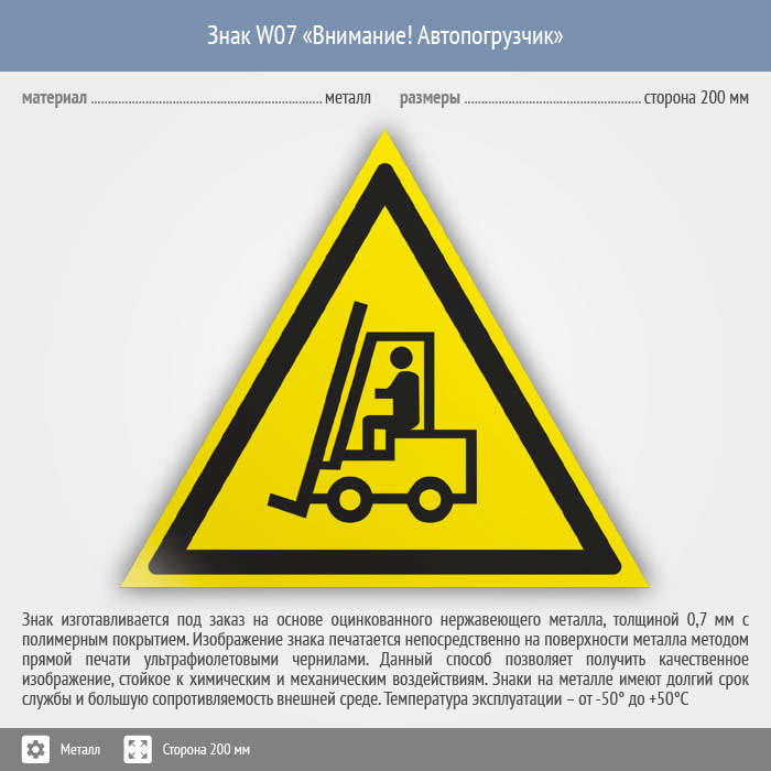 Знак W07 «Внимание! автопогрузчик» (металл, сторона 200 мм) в Пензе купить