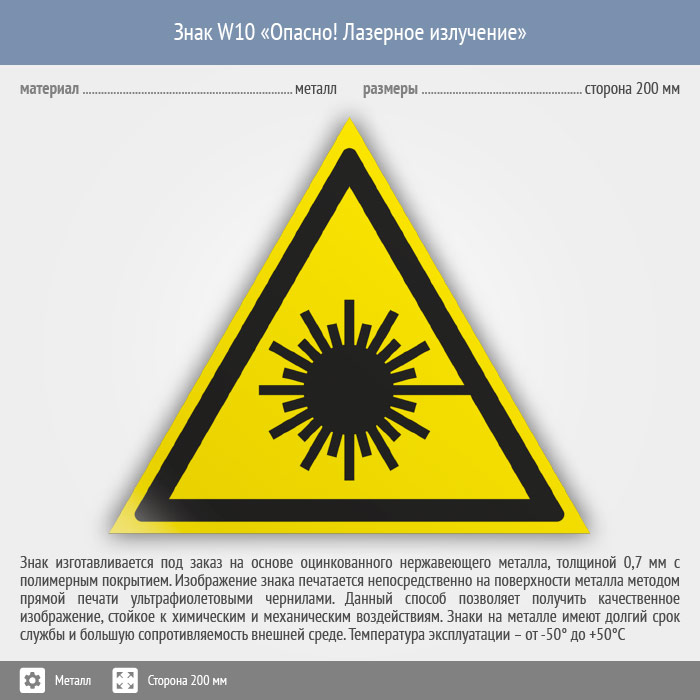 Знак W10 «Опасно! лазерное излучение» (металл, сторона 200 мм) в Пензе купить