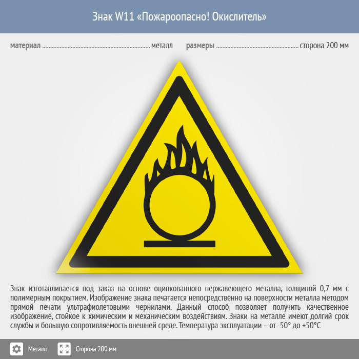 Знак W11 «Пожароопасно! окислитель» (металл, сторона 200 мм) в Пензе купить