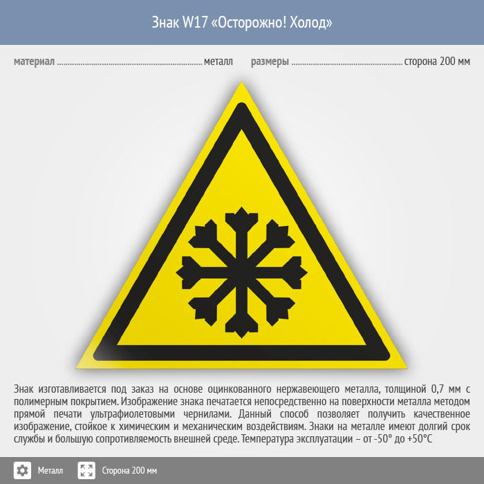 Знак W17 «Осторожно! холод» (металл, сторона 200 мм) в Пензе купить