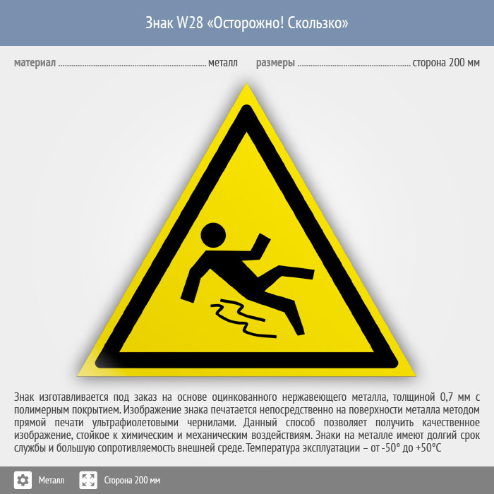 Знак W28 «Осторожно! скользко» (металл, сторона 200 мм) в Пензе купить
