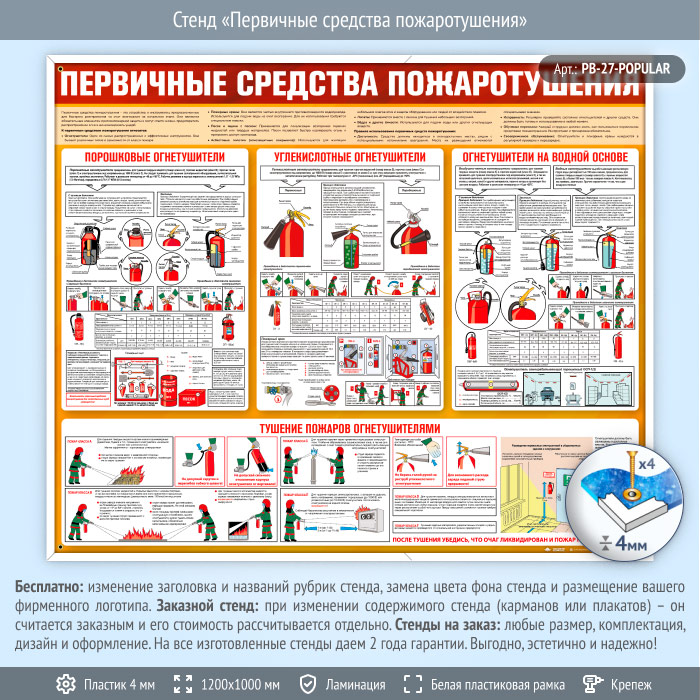 Стенд «Первичные средства пожаротушения» (PB-27) предоставляет важную информацию о различных типах огнетушителей и их использовании. Он включает сведения о порошковых, углекислотных огнетушителях, огнетушителях на водной основе, а также инструкции по эффективному тушению пожаров с их помощью. Этот стенд станет надежным помощником в обеспечении пожарной безопасности и поможет быстро и правильно реагировать в случае возгорания.