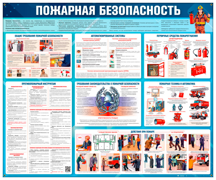 Стенд «Пожарная безопасность» (PB-29) содержит наглядную информацию по обеспечению пожарной безопасности на объекте. На стенде представлены общие требования, порядок проведения противопожарного инструктажа, действия при пожаре в общественных зданиях и на предприятиях. Освещены виды первичных средств пожаротушения, автоматизированные системы защиты, средства оповещения и эвакуации, а также требования законодательства и ответственность граждан. Стенд помогает формировать культуру безопасности, обучать персонал и предотвращать чрезвычайные ситуации, связанные с пожарами.