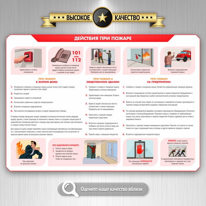 Стенд «Умей действовать при пожаре» содержит самые важные аспекты пожарной безопасности. Чисто теоретических плакатов здесь всего 2 - «Требования законодательства о ПБ» и «Противопожарный инструктаж». Все же остальные - максимально практичные и наглядно объясняют причины пожаров, как их не допустить и что делать, если пожар все же произошел. Также подробно освещена тема оказания первой помощи при ожогах разной степени тяжести. Как всегда, только актуальная информация, качественные иллюстрации и современный дизайн!