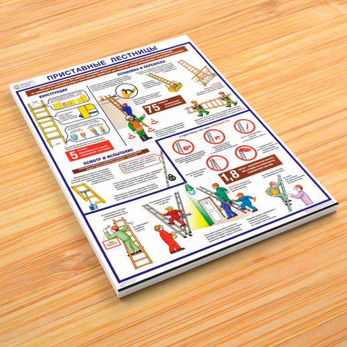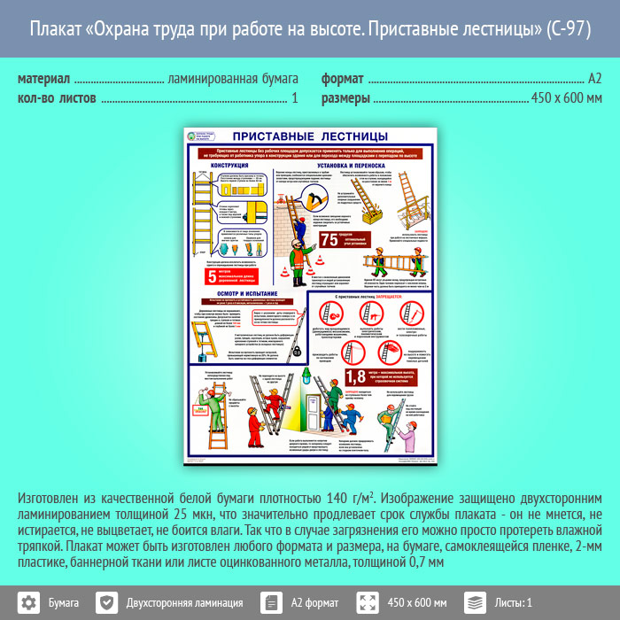 Плакат «Охрана труда при работе на высоте. Приставные лестницы» (С-97, ламинированная бумага, А2, 1 лист) в Пензе купить