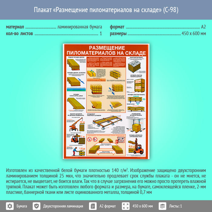 Плакат «Размещение пиломатериалов на складе» (С-98, ламинированная бумага, А2, 1 лист) в Пензе купить