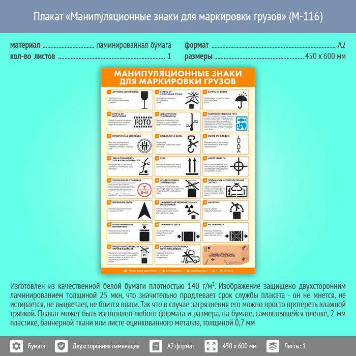 Плакат «Манипуляционные знаки для маркировки грузов» (М-116, ламинированная бумага, А2, 1 лист) в Пензе купить