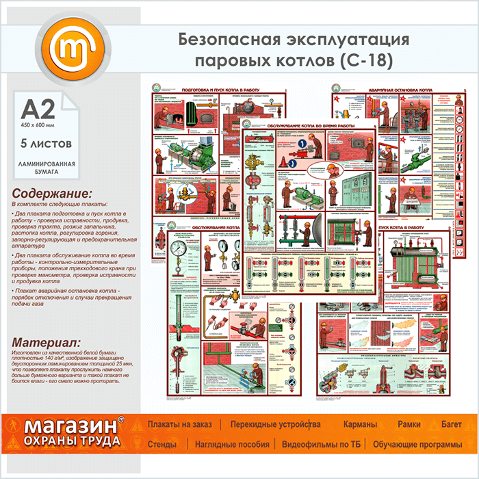 Плакаты «Безопасная эксплуатация паровых котлов» (С-18, ламинированная бумага, А2, 5 листов) в Пензе купить