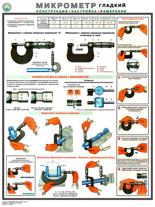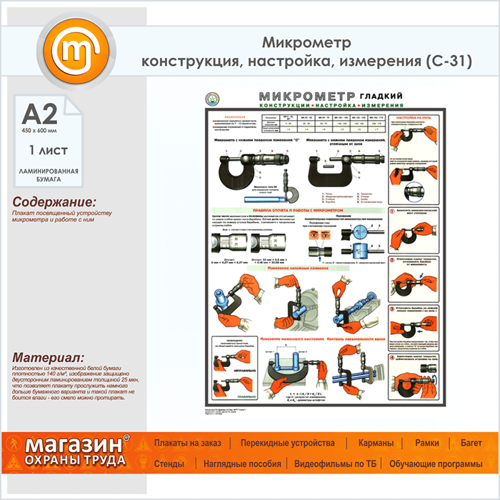 Плакат «Микрометр - конструкция, настройка, измерения» (С-31, ламинированная бумага, А2, 1 лист) в Пензе купить