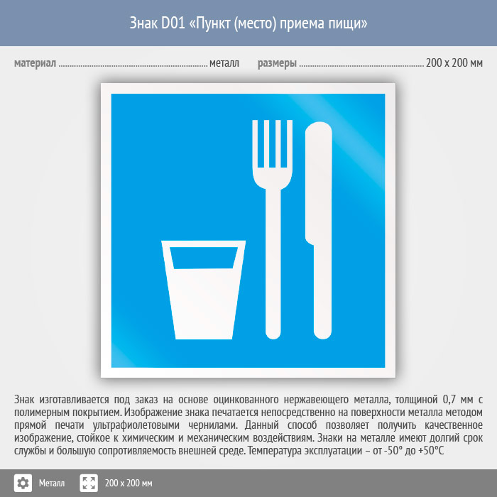 Знак D01 «Пункт (место) приема пищи» (металл, 200х200 мм) в Пензе купить