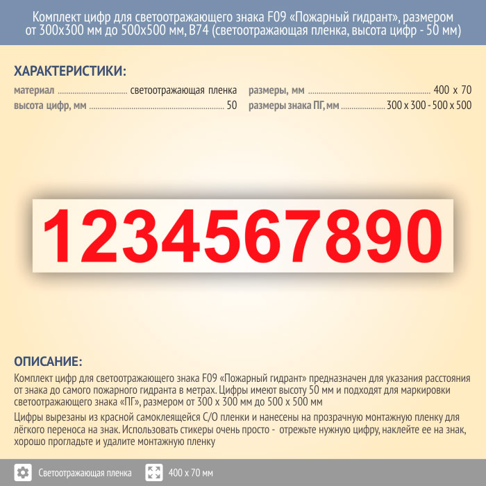 Комплект цифр для светоотражающего знака F09 «Пожарный гидрант», размером от 300х300 мм до 500х500 мм, В74 (светоотражающая пленка, 400х70 мм, высота цифр - 50 мм) в Пензе купить