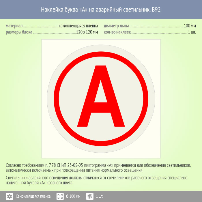 Наклейка буква «А» на аварийный светильник, B92 (пленка, диаметр 100 мм, 120х120 мм) в Пензе купить