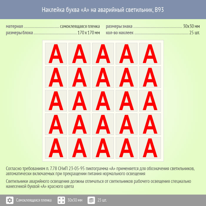 Наклейка буква «А» на аварийный светильник, B93 (пленка, 30х30 мм, блок 25 штук, 170х170 мм) в Пензе купить