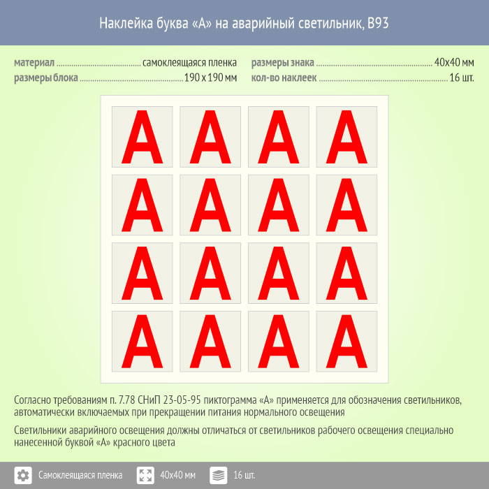 Наклейка буква «А» на аварийный светильник, B93 (пленка, 40х40 мм, блок 16 штук, 190х190 мм) в Пензе купить
