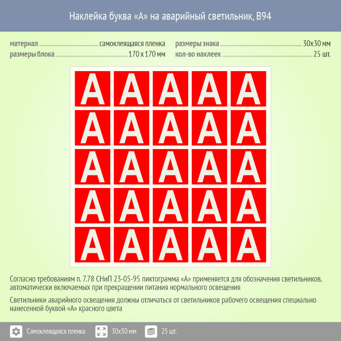 Наклейка буква «А» на аварийный светильник, B94 (пленка, 30х30 мм, блок 25 штук, 170х170 мм) в Пензе купить