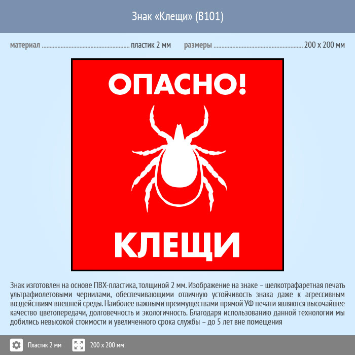 Знак «Опасно! Клещи», B101 (пластик, 200х200 мм) в Пензе купить