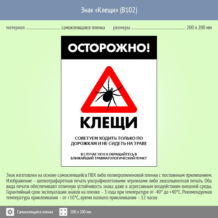 Знак «Осторожно! Клещи», B102 (пленка, 400х600 мм) в Пензе купить