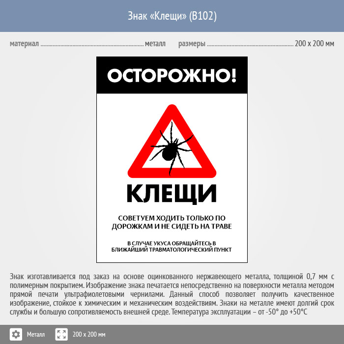 Знак «Осторожно! Клещи», B102 (металл, 400х600 мм) в Пензе купить