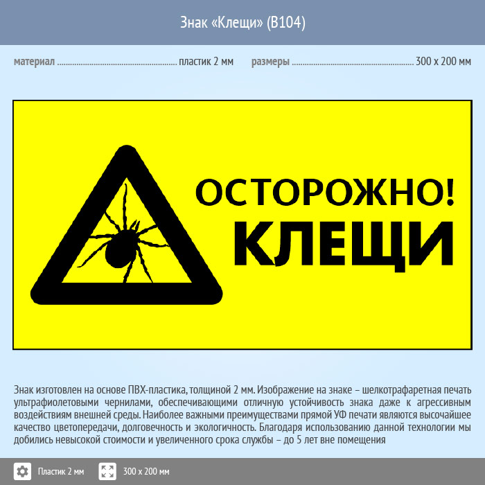 Знак «Осторожно! Клещи», B104 (пластик, 400х300 мм) в Пензе купить