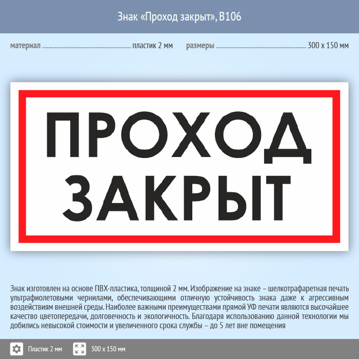Знак «Проход закрыт», B106 (пластик, 300х150 мм) в Пензе купить