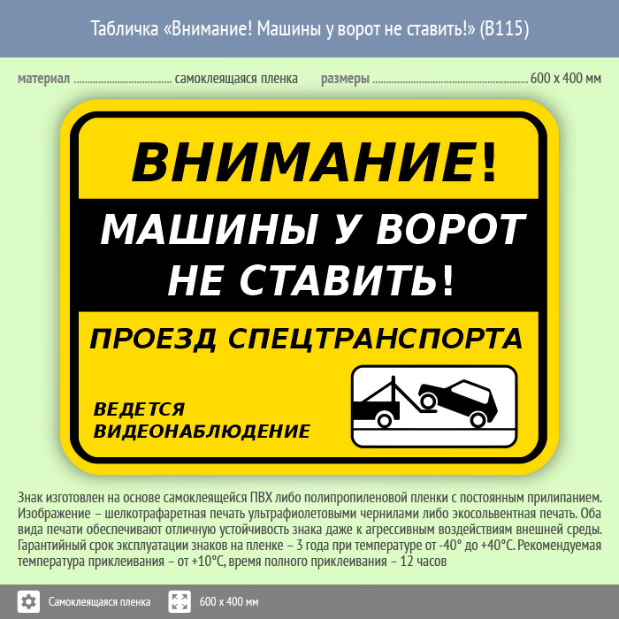 Табличка «Внимание! Машины у ворот не ставить!», B115 (пленка, 600х400 мм) в Пензе купить