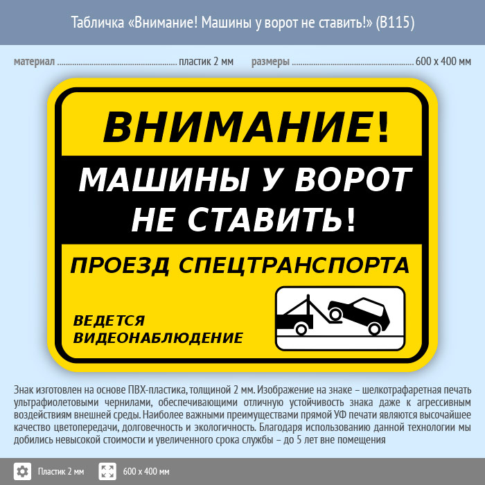 Табличка «Внимание! Машины у ворот не ставить!», B115 (пластик, 600х400 мм) в Пензе купить