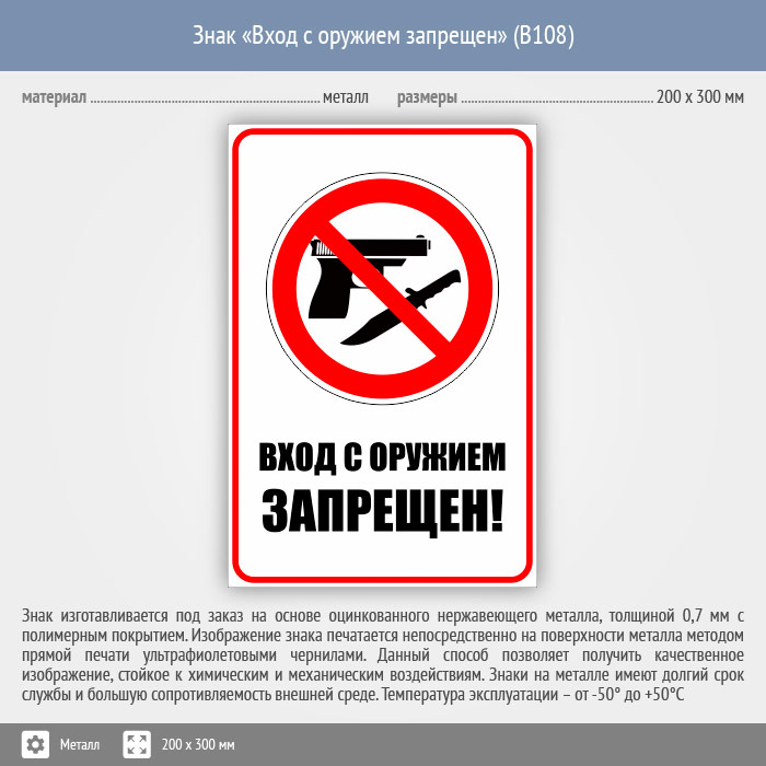 Знак «Вход с оружием запрещен», B108 (металл, 200х300 мм) в Пензе купить