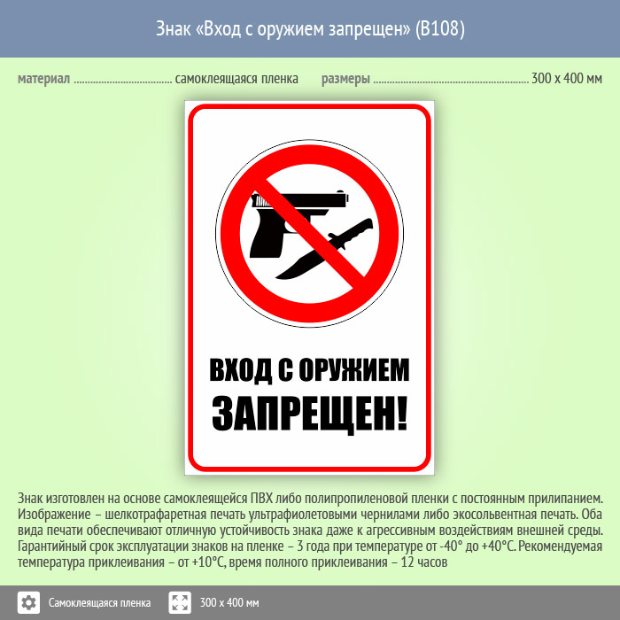 Знак «Вход с оружием запрещен», B108 (пленка, 300х400 мм) в Пензе купить