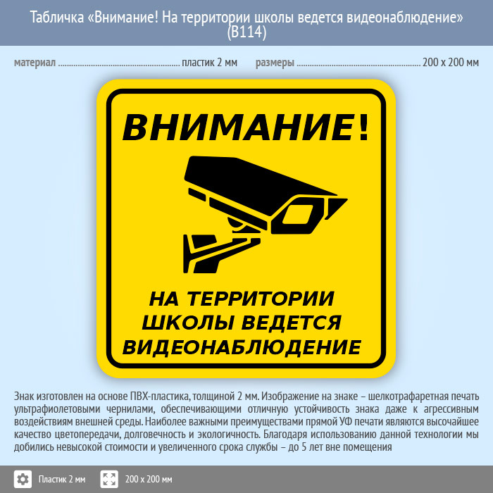 Табличка «Внимание! На территории школы ведется видеонаблюдение», B114 (пластик, 200х200 мм) в Пензе купить