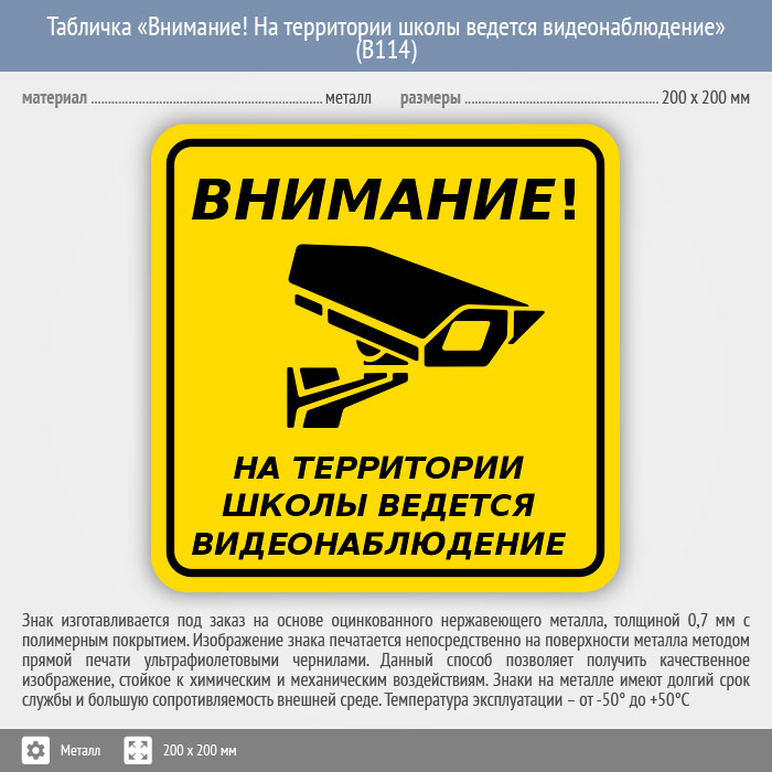 Табличка «Внимание! На территории школы ведется видеонаблюдение», B114 (металл, 200х200 мм) в Пензе купить
