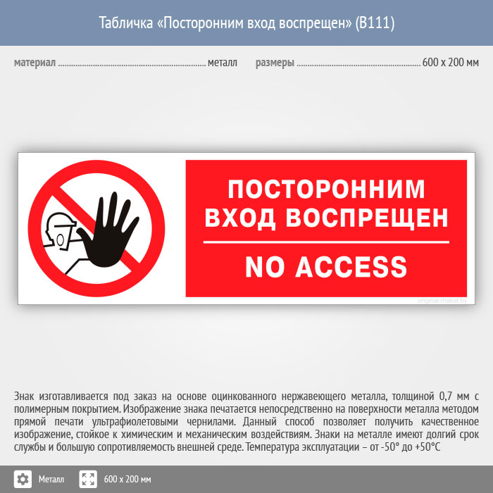 Табличка «Посторонним вход воспрещен», B111 (металл, 600х200 мм) в Пензе купить