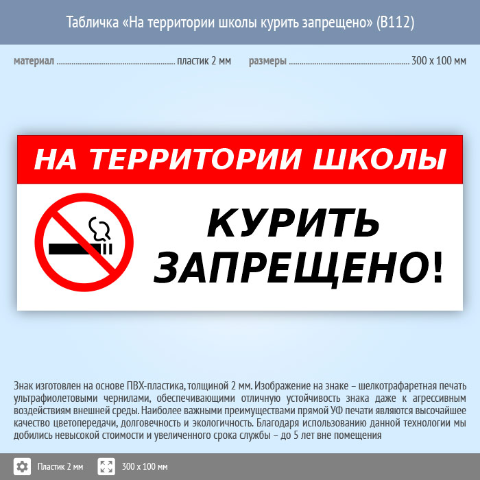 Табличка «На территории школы курить запрещено», B112 (пластик, 300х100 мм) в Пензе купить