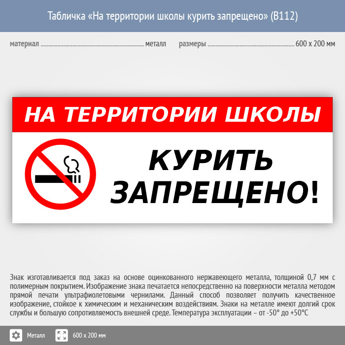 Табличка «На территории школы курить запрещено», B112 (металл, 600х200 мм) в Пензе купить
