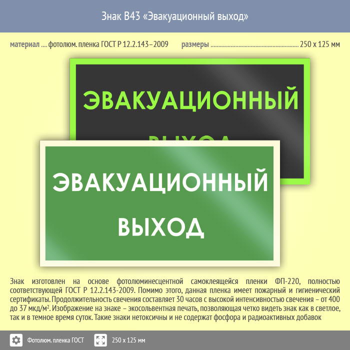 Знак B43 «Эвакуационный выход» (фотолюминесцентная пленка ГОСТ 34428-2018, 250х125 мм) в Пензе купить