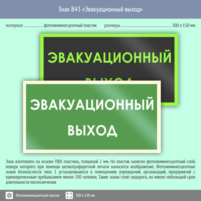 Знак B43 «Эвакуационный выход» (фотолюминесцентный пластик, 300х150 мм) в Пензе купить
