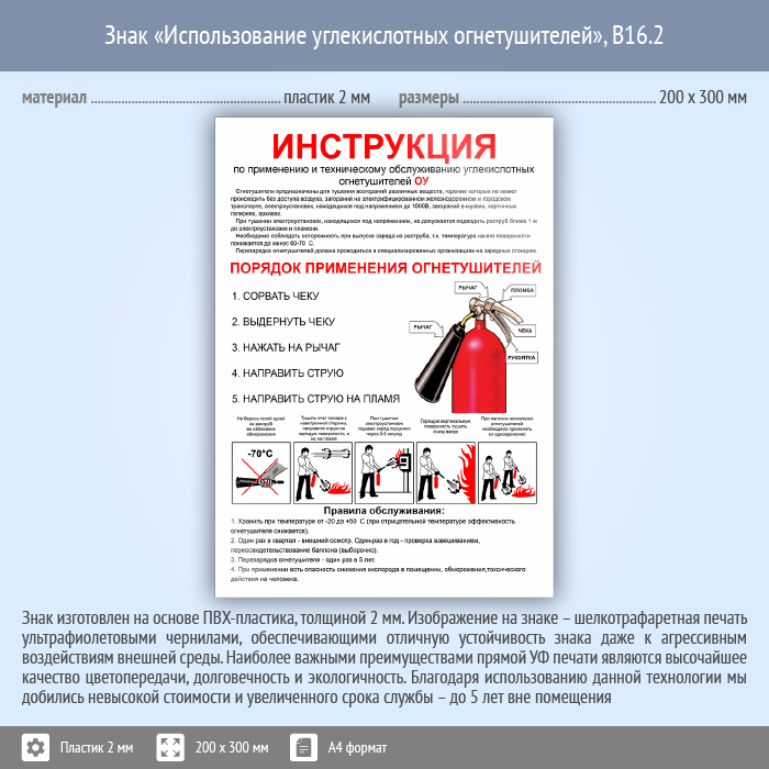 Знак «Использование углекислотных огнетушителей», B16.2 (пластик, 200х300 мм) в Пензе купить