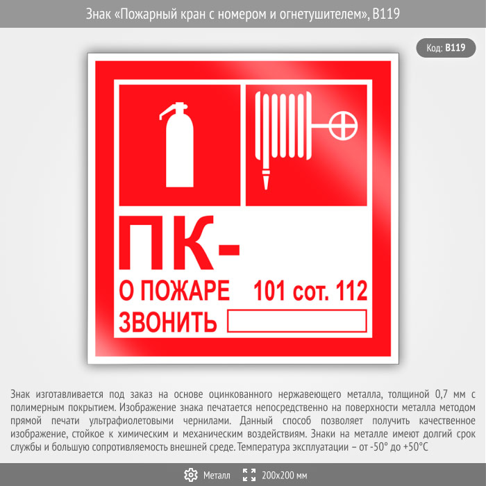 Знак «Пожарный кран с номером и огнетушителем», B119 (металл, 200х200 мм) в Пензе купить