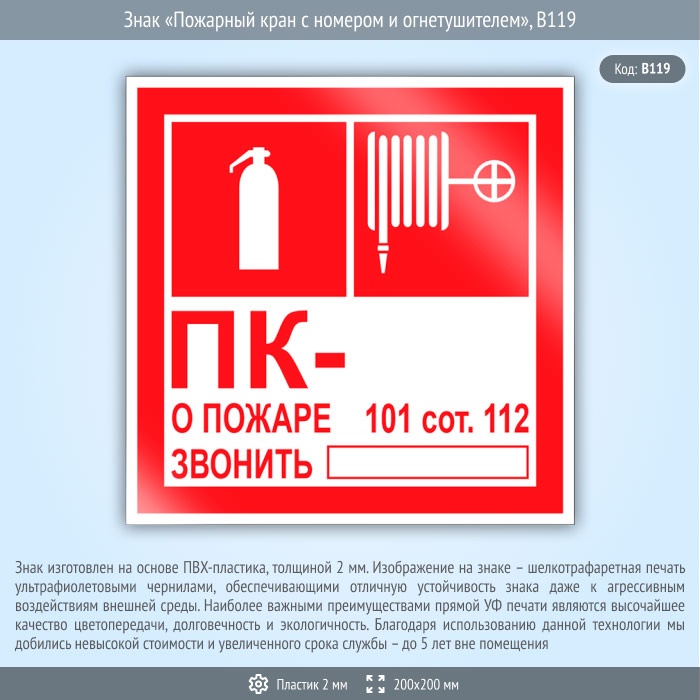 Знак «Пожарный кран с номером и огнетушителем», B119 (пластик, 200х200 мм) в Пензе купить