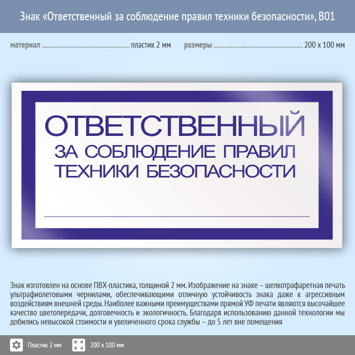 Знак «Ответственный за соблюдение правил техники безопасности», B01 (пластик, 200х100 мм) в Пензе купить
