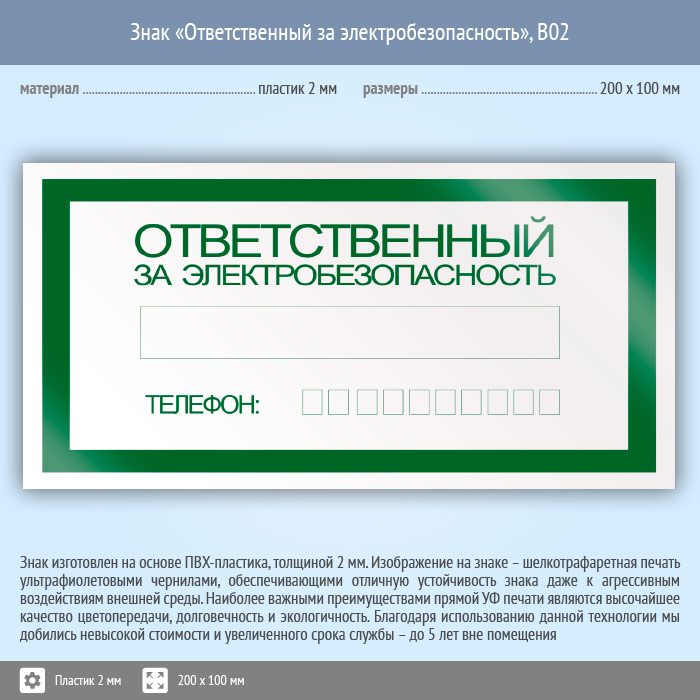 Знак «Ответственный за электробезопасность», B02 (пластик, 200х100 мм) в Пензе купить